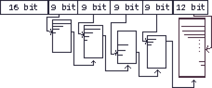 The final 9 bits are used to index into the fourth-level table. The entry found here contains the address of a physical 4 KB memory page in RAM.