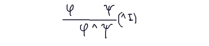 Example: Let φ and ψ denote statements. The ^I (and introduction) rule combines two statements (φ, ψ) to derive their conjunction (φ ^ ψ).