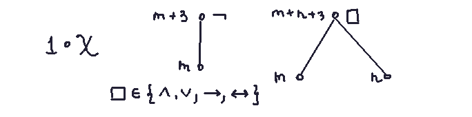 Binary nodes: Adds m + n + 3 symbols , where m and n are the symbol counts of the left and right subformulas (e.g., (φ ^ ψ) contains 5 symbols: parentheses, operator, and the two subformulas).