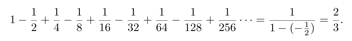 This series is geometric with first term 1 and common ratio r = −1/2. Using the formula 1/(1 − r) for the sum of a geometric series, we get: