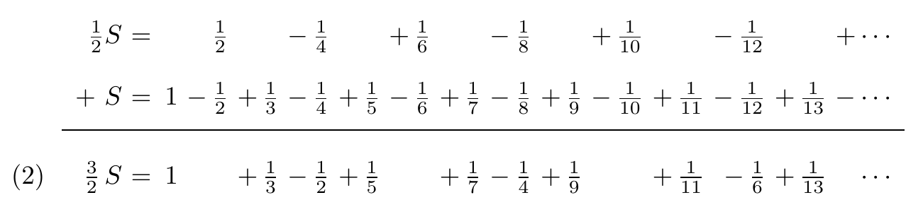 Upon closer inspection, equations (1) and (2) contain identical terms, just reordered. This rearrangement alters the series sum, inflating it to 3/2 times its original value. For instance, computing the first few hundred terms of equation (2) yields partial sums clustering around 1.03 - a concrete demonstration of how infinite series defy finite intuition.